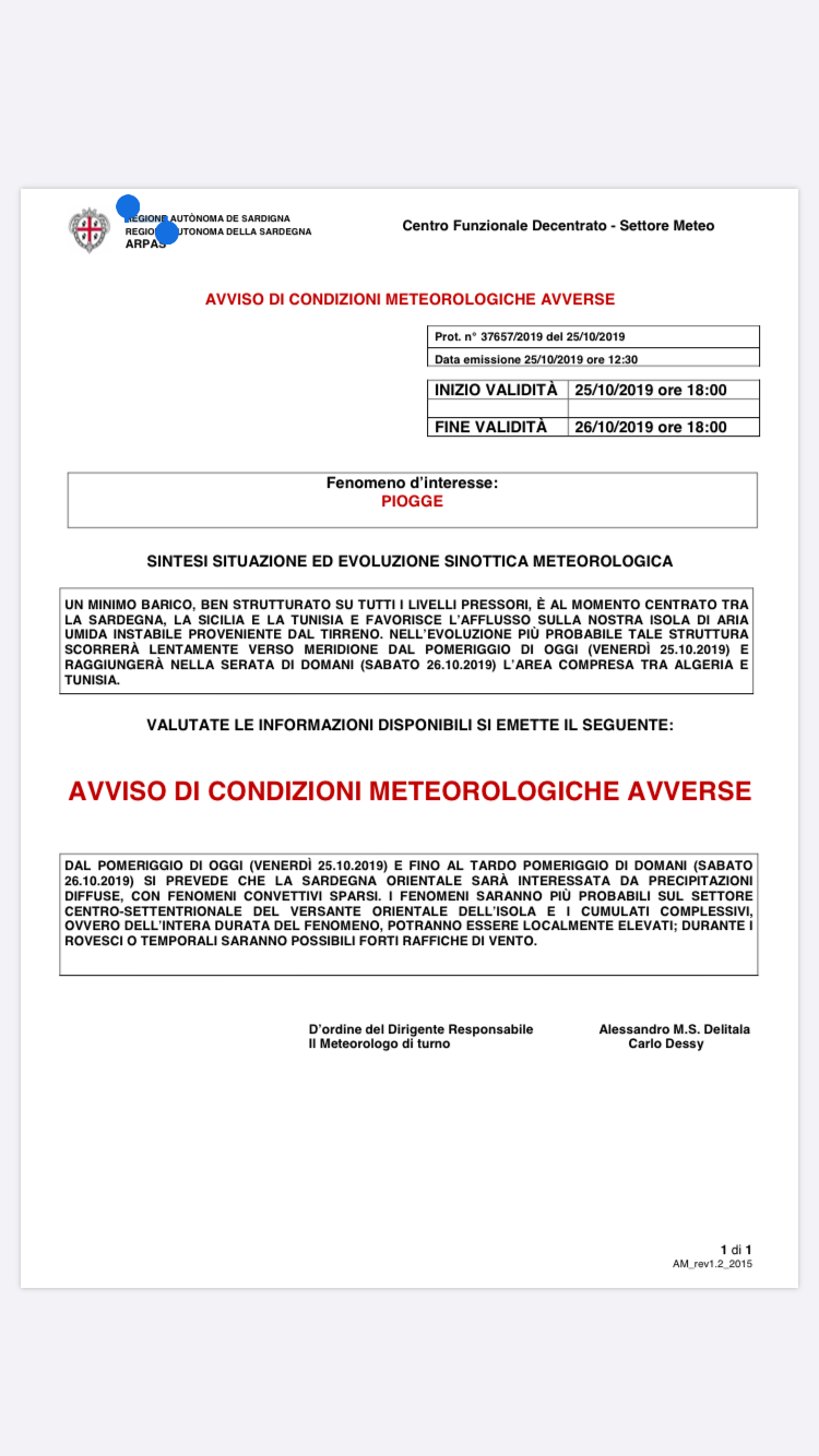 Avviso di condizioni meteorologiche avverse dalle ore 18,00 del 25/10 alle ore 18,00 del 26/10/2019