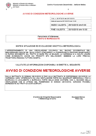 AVVISO DI CONDIZIONI METEOROLOGICHE AVVERSE del 01/11/2018