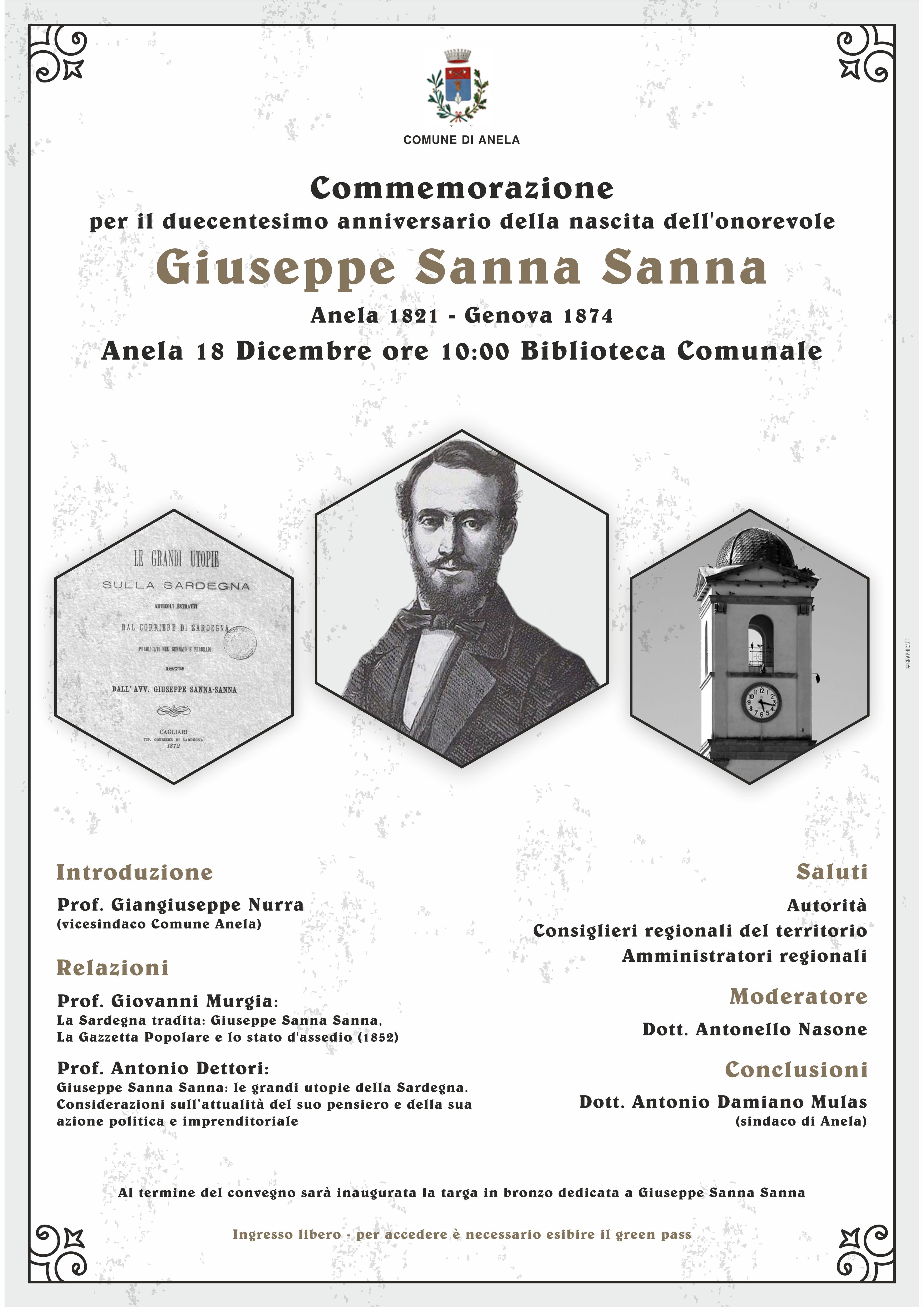 COMMEMORAZIONE PER IL DUECENTESIMO ANNIVERSARIO DELLA NASCITA DELL'ONOREVOLE GIUSEPPE SANNA SANNA ANELA 1821 - GENOVA 1874